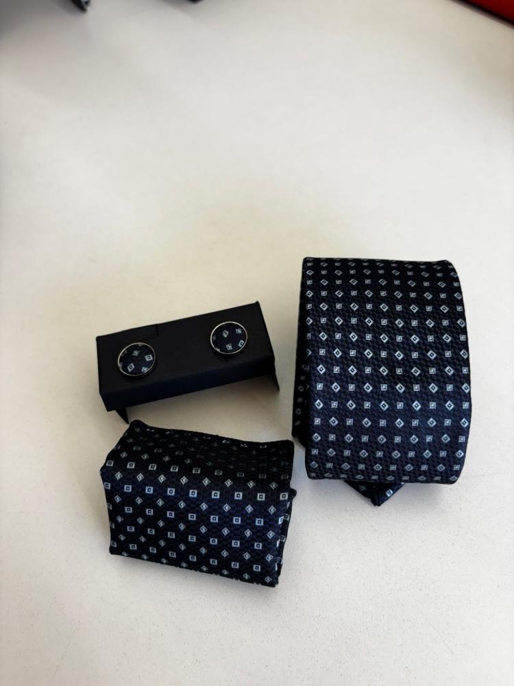 A gravata traz acabamento refinado e caimento impecável, enquanto o lenço de bolso adiciona um toque de estilo e personalidade ao traje. As abotoaduras complementam o visual com sofisticação, garantindo um detalhe discreto e marcante na medida certa.